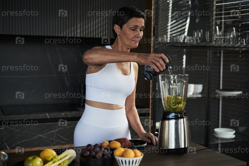 Женщина среднего возраста готовит здоровый смузи с помощью блендера