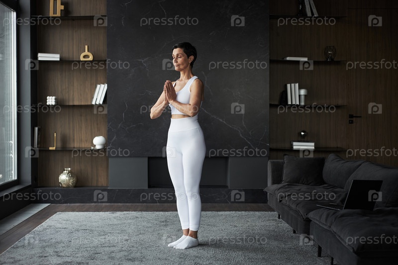 Женщина средних лет практикует йогу в современной гостиной