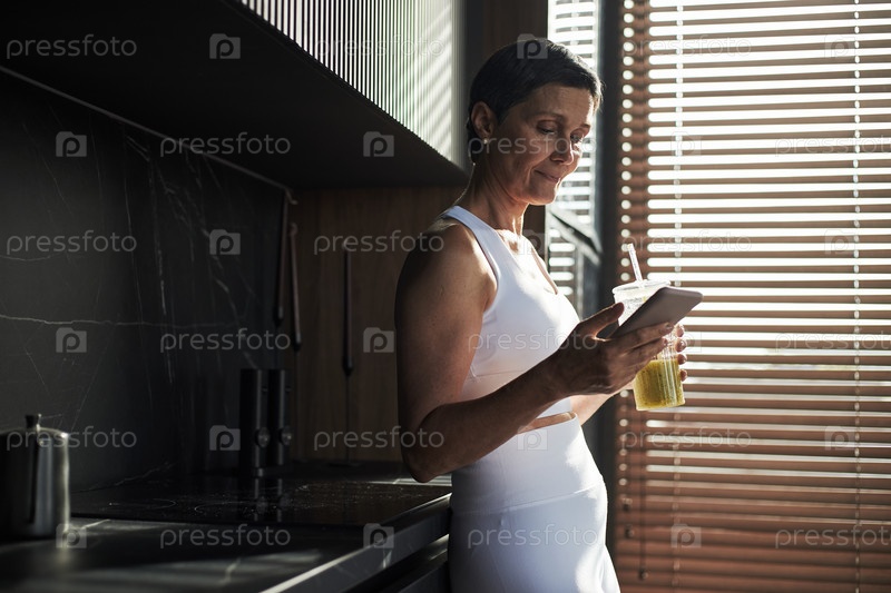 Женщина среднего возраста использует смартфон, выпивая зеленый смузи