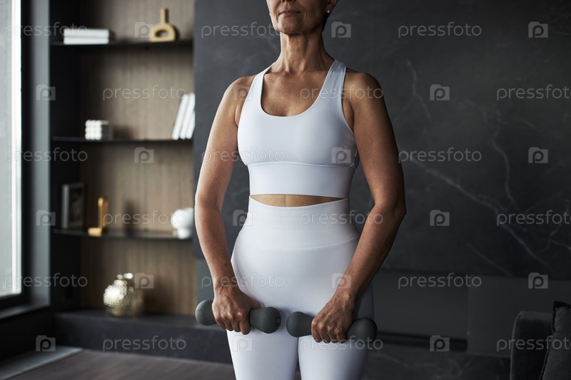 Женщина среднего возраста, занимающаяся спортом в помещении, держащая гантели