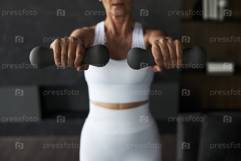 Женщина среднего возраста держит гантели, выполняя подъем рук в помещении