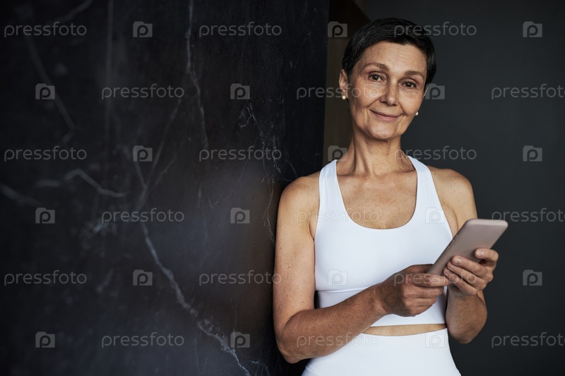 Портрет женщины среднего возраста, улыбающейся во время использования смартфона в помещении