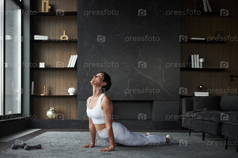 Женщина среднего возраста практикует йогу растяжные упражнения в помещении