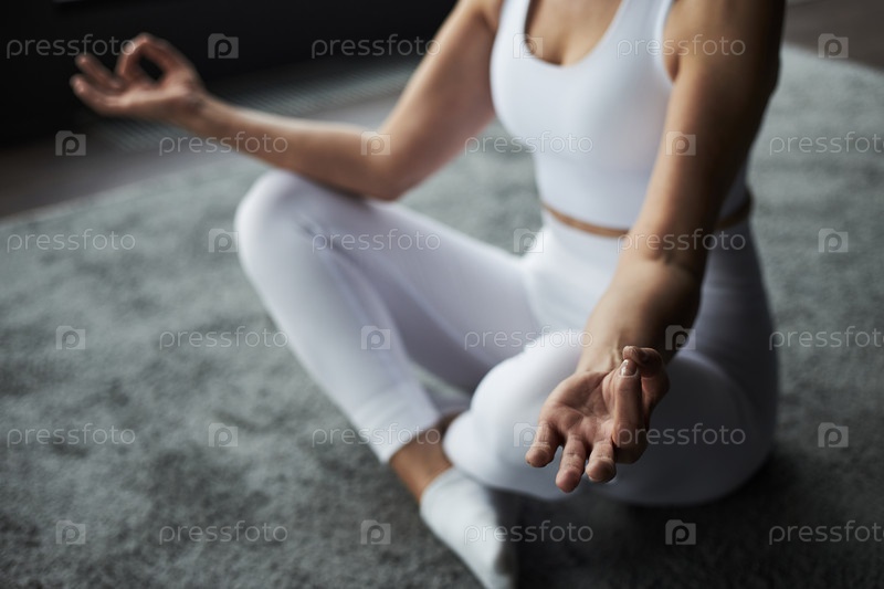 Практикующая медитацию сидящая женщина с крестовыми ногами в помещении
