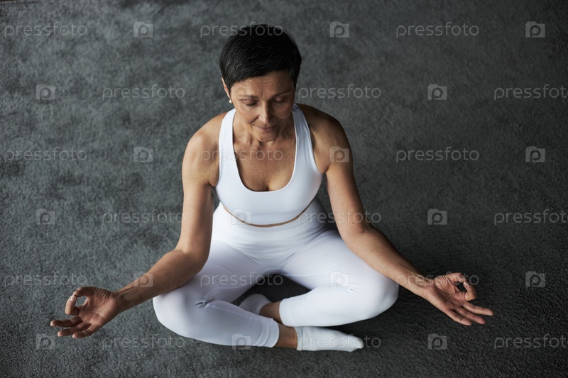 Женщина среднего возраста медитирует в положении лотоса на йога-матке в помещении