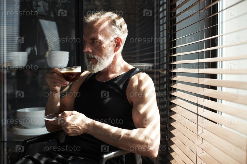 Мужчина средних лет пьет кофе, сидя возле жалюзи