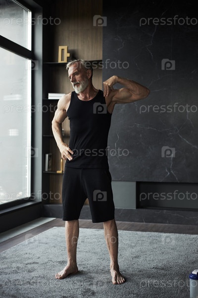 Старший мужчина согревается, стоя в современной комнате