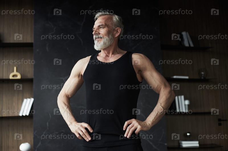 Портрет мужчины среднего возраста, уверенно стоящего с руками на бедрах