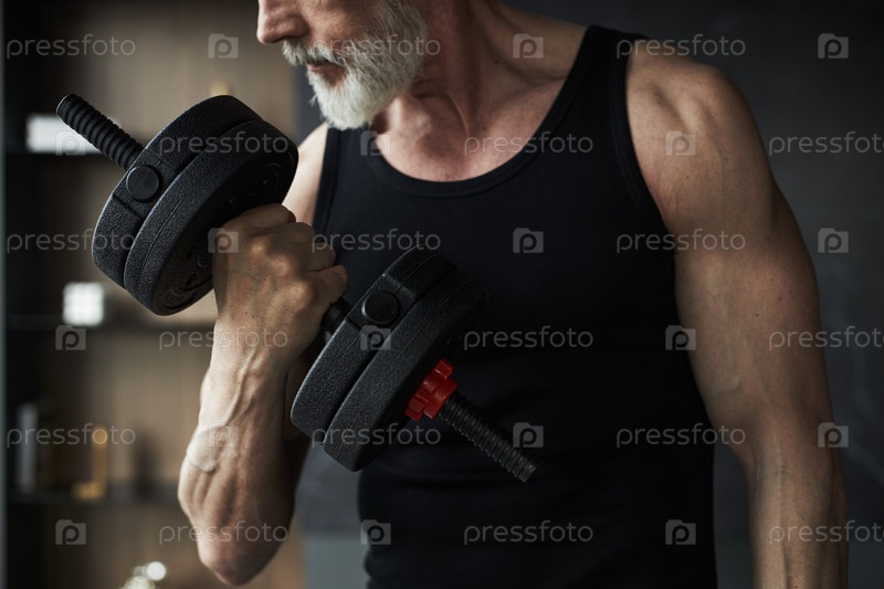 Старший мужчина упражняется мышцы рук поднимает гантели в помещении