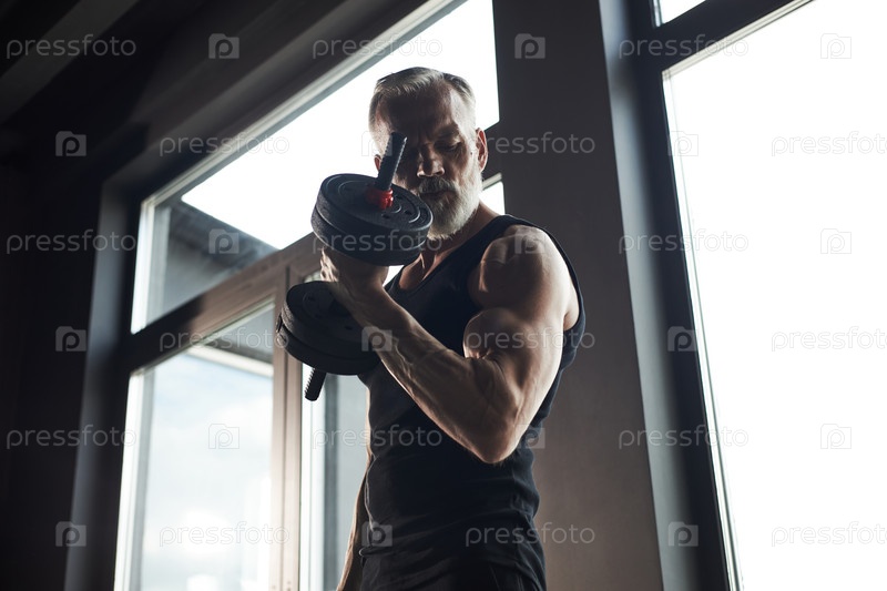 Мужчина-старший поднимает гантели во время силовых тренировок в помещении