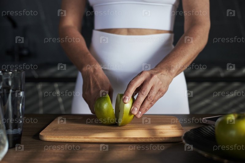 Женщина, нарезающая зеленое яблоко на деревянной доске для резки