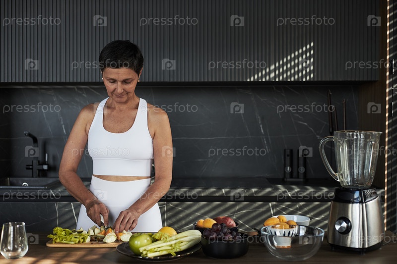 Женщина среднего возраста нарезает свежие продукты для приготовления здорового смузи