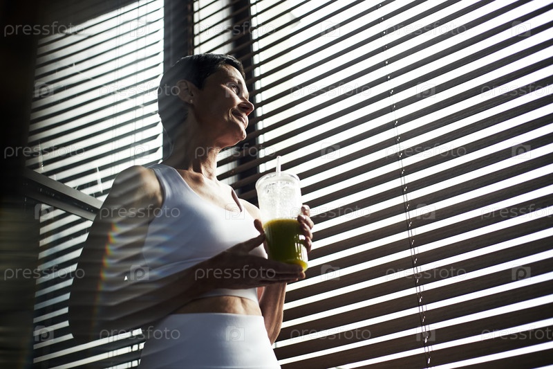 Женщина среднего возраста пьет смузи, стоя возле жалюзи