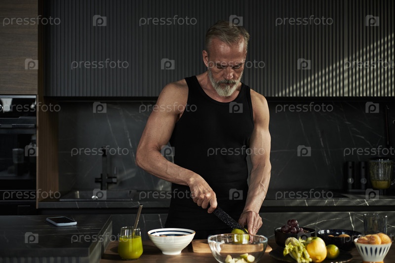 Мужчина средних лет готовит здоровую еду на современной кухне