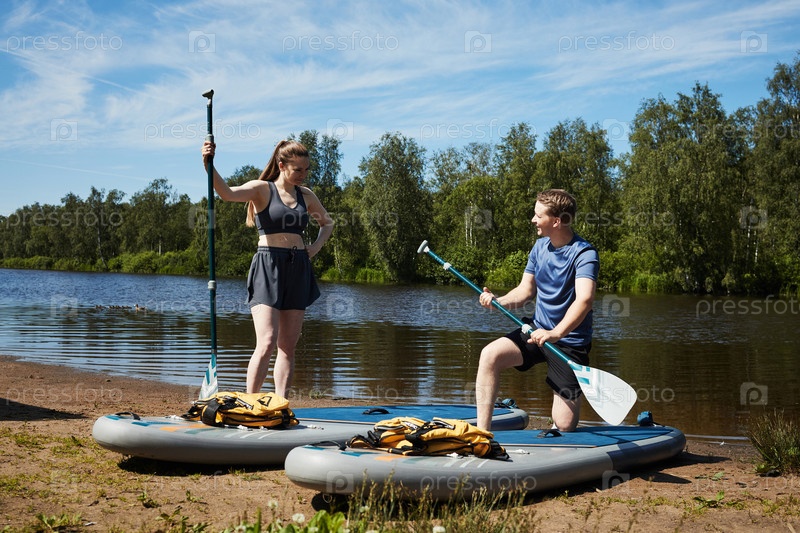 Молодой мужчина и молодая женщина готовят гребные доски на открытом воздухе у берегов рек
