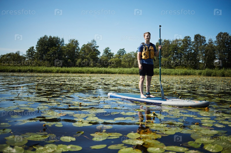 Молодой человек падлбордирует в одиночку на озере, окруженном водяными лилиями