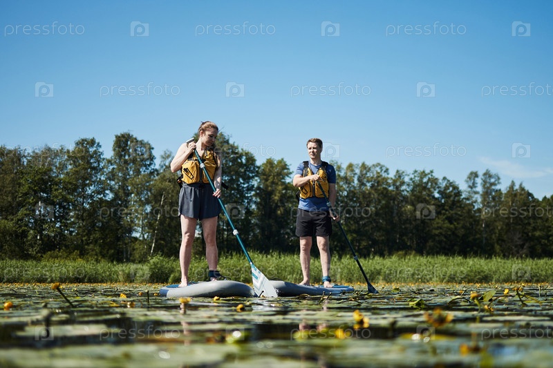 Молодой мужчина и молодая женщина вместе катаются на гребле на озере, окруженном природой