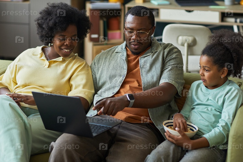 Черная семья сидит вместе и смотрит видео на ноутбуке в гостиной