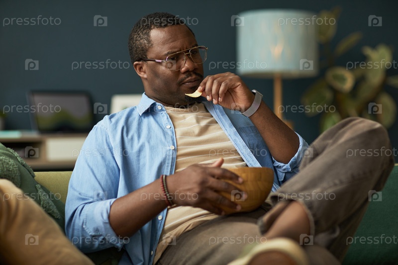Черный мужчина отдыхает на диване, ест закуски и смотрит телевизор