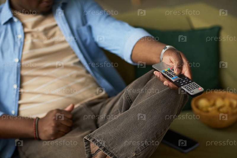 Черный мужчина отдыхает на диване держит пульт дистанционного управления смотрит телевизор