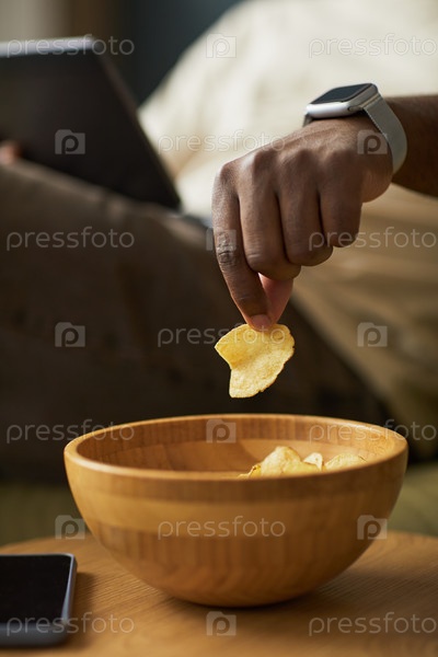 Молодой взрослый чернокожий мужчина достигает картофельного чипа, используя цифровой планшет