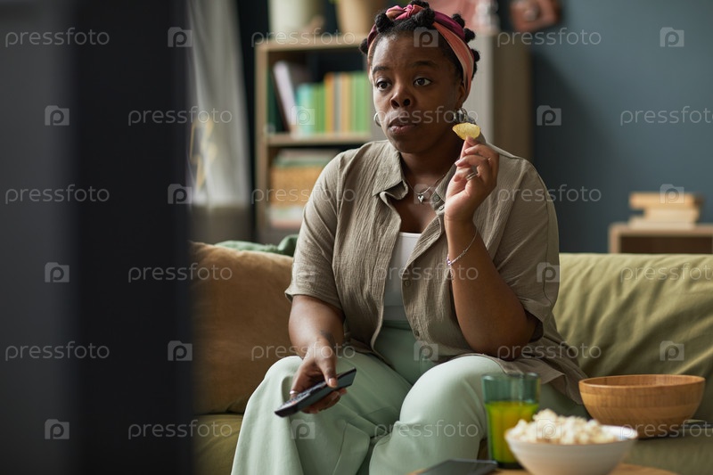 Молодая взрослая чернокожая женщина смотрит телевизор и ест закуску на диване