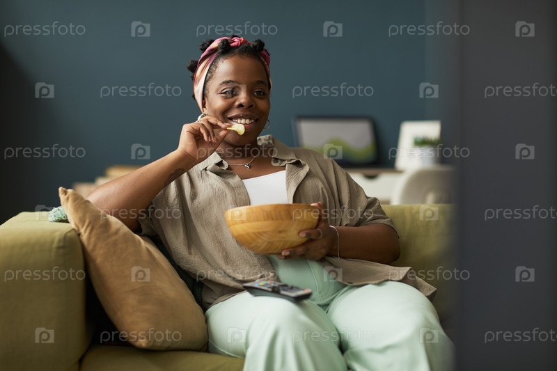 Портрет молодой взрослой чернокожей женщины, улыбающейся во время еды закуски на диване