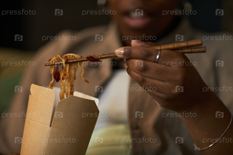 Молодая взрослая чернокожая женщина ест лапши с палочками из коробки для удаления
