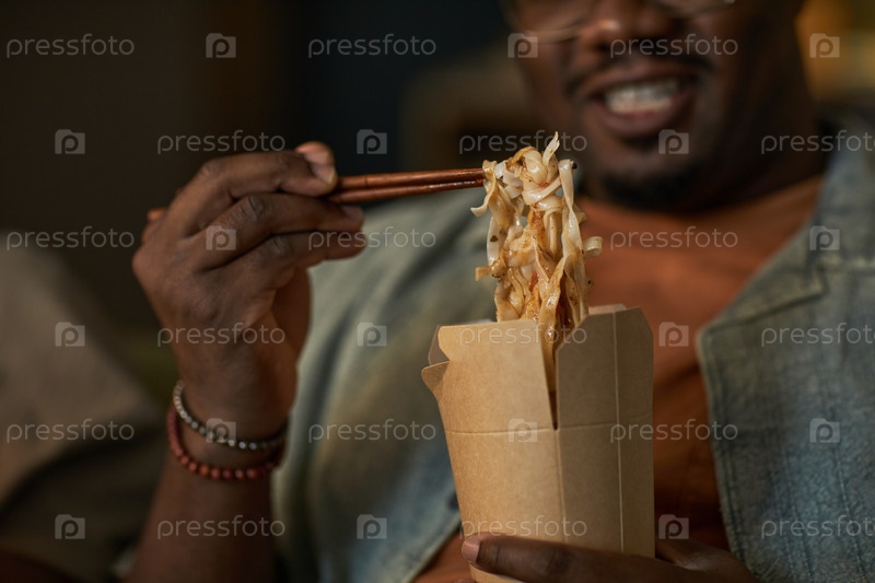 Молодой взрослый чернокожий мужчина ест азиатские лапши с палочками в помещении улыбается