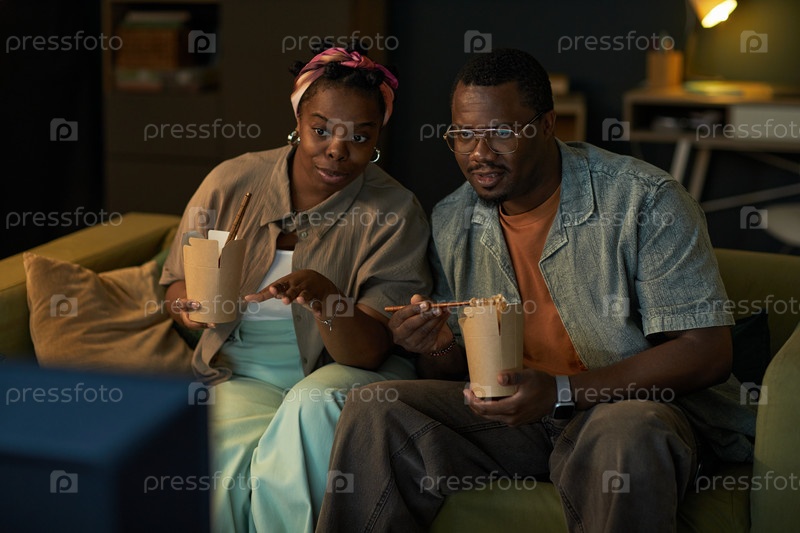 Молодая черная пара сидит на диване, ест выносную пищу и смотрит телевизор