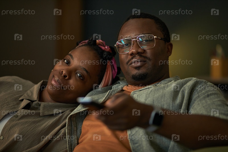 Портрет молодой взрослой чернокожей пары, отдыхающей вместе и смотрящей телевизор