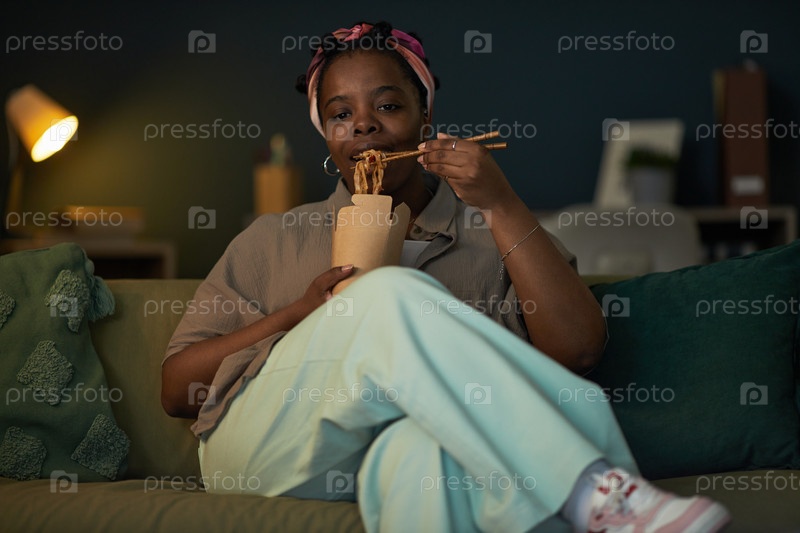 Молодая взрослая чернокожая женщина сидит в помещении, ест лапши с палочками