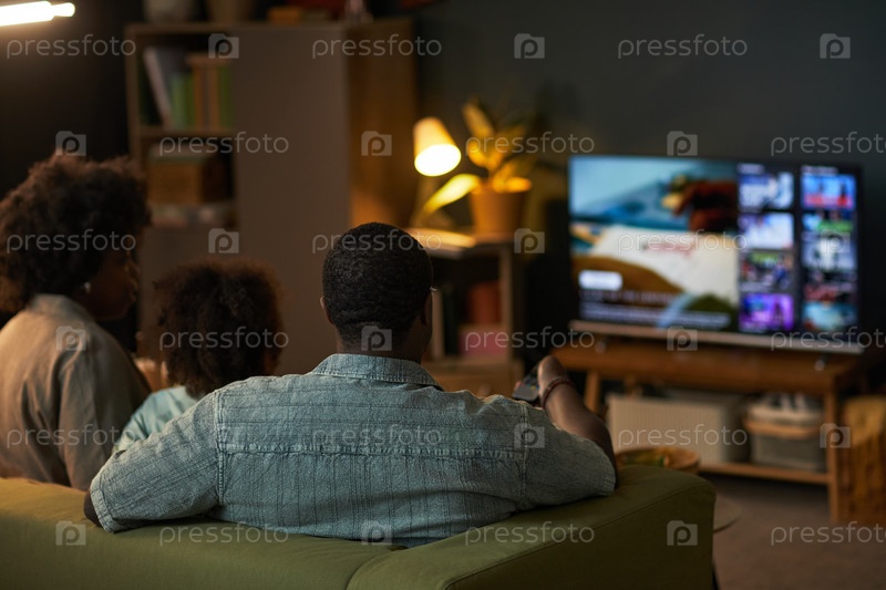 Черная семья сидит вместе, смотря потоковый контент на экране телевизора