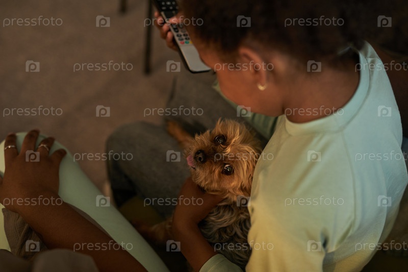 Молодая черная девушка держит маленькую собаку, используя дистанционное управление дома