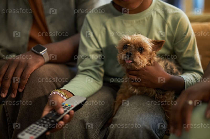 Черный ребенок держит маленькую собаку, меняя канал с помощью пульта дистанционного управления