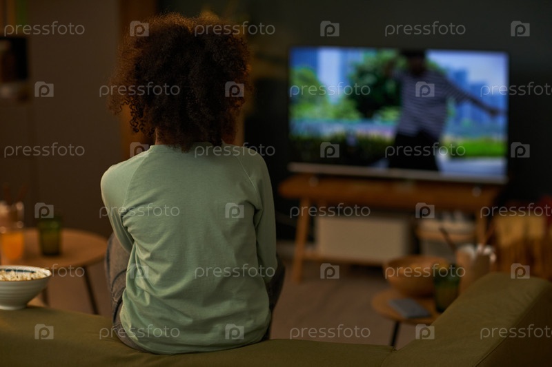Черный ребенок смотрит телевизор, сидя на диване в помещении