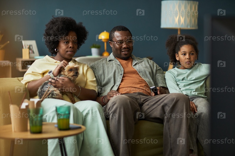 Черная семья смотрит телевизор вместе, сидя дома на диване