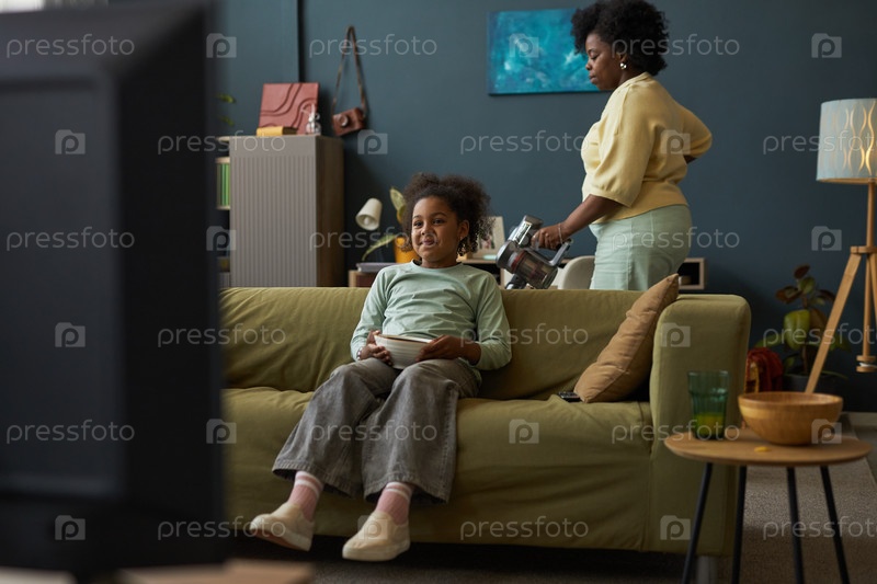 Черная девушка смотрит телевизор, в то время как молодая чернокожая женщина пылесосает