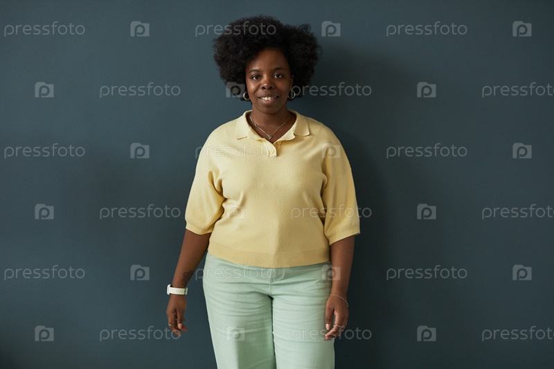 Портрет молодой взрослой чернокожей женщины, улыбающейся, стоящей на стене