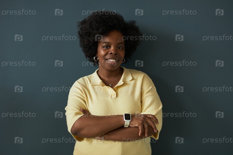Портрет молодой взрослой чернокожей женщины, улыбающейся с перекрещенными руками в помещении