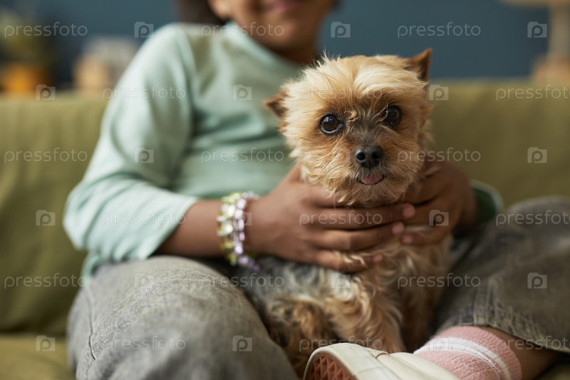 Молодая черная девушка держит маленькую собаку, сидя в помещении на диване