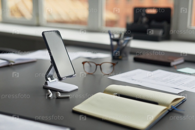 Цифровой планшет стоит на рабочем столе, окружен офисными принадлежностями и документами