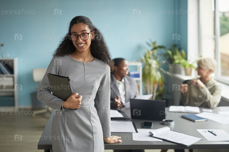 Портрет молодой взрослой женщины, улыбающейся во время офисной встречи