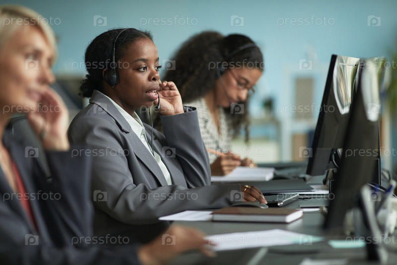 Молодая чернокожая женщина работает в колл-центре, носит наушники и использует компьютер