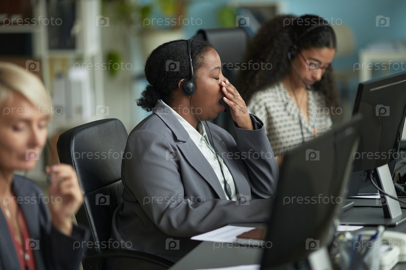 Молодая взрослая чернокожая женщина зевает, работая на компьютере в офисной обстановке