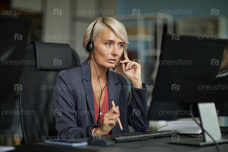Женщина средних лет работает на компьютере, разговаривая с наушниками