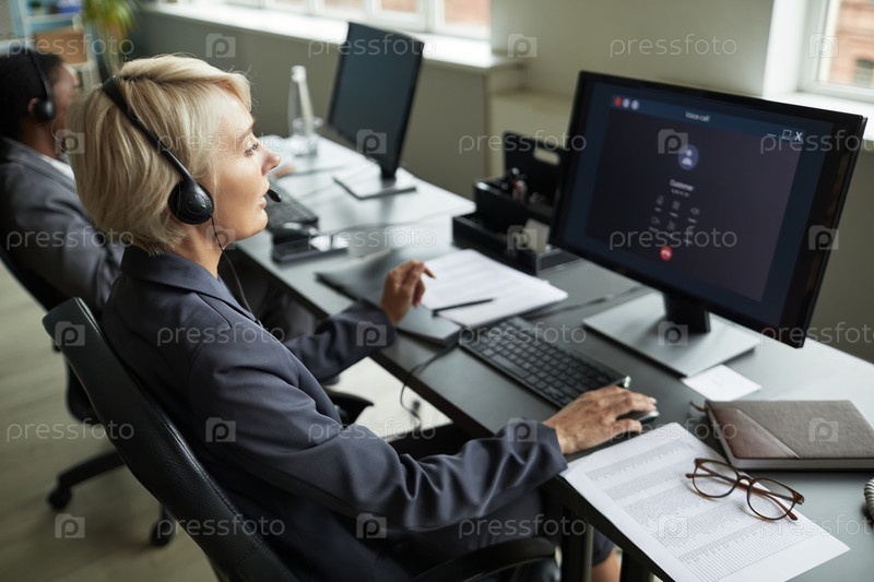 Женщина средних лет отвечает на звонки клиентов в современном офисе