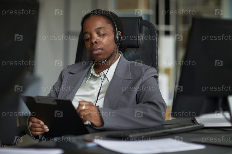 Черная женщина, носящая наушники, просматривает документы за рабочим столом