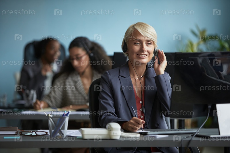 Женщина среднего возраста, носящая наушники, помогает клиентам в офисе