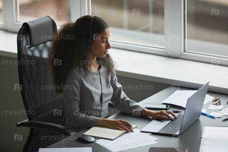 Молодая взрослая женщина, работающая за рабочим столом с использованием ноутбука и наушников в офисе